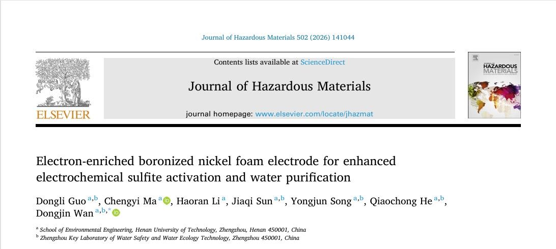 2026年1月7日,我校环境工程学院万东锦教授团队在国际著名学术期刊《Journal of Hazardous Materials》(影响因子IF = 12.2)发表题为“Electron-enriched boronized nickel foam electrode for enhanced electrochemical sulfite activation and water purification”(DOI: 10.1016/j.jhazmat.2026.141044)的研究性论文。《Journal of Hazardous Materials》(简称JHM),创刊于1975年,是Elsevier旗下专注于危险材料及其对人类和环境影响研究的国际顶级期刊,...