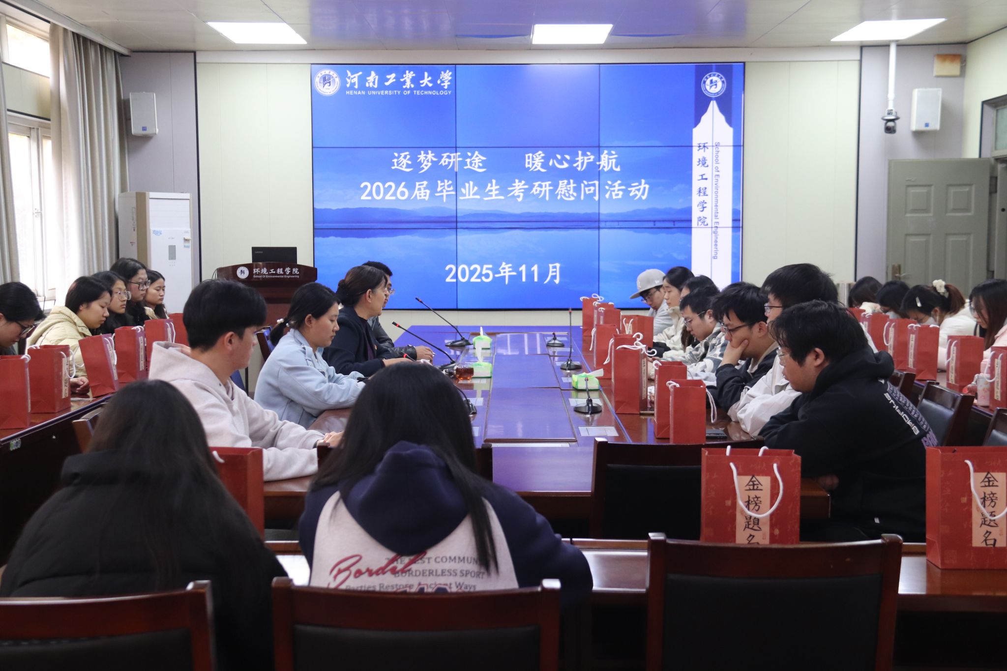 为进一步了解2026届考研学生的备考状态,传递学院的温暖与关怀,为学子们加油鼓劲、舒缓压力,11月12日下午,环境工程学院组织开展“逐梦研途,暖心护航—2026届毕业生考研慰问活动”。学院党委书记宋芙晖、党委副书记杨计国、毕业班辅导员周阳阳及60余名考研学生代表参加了活动。活动由周阳阳主持。