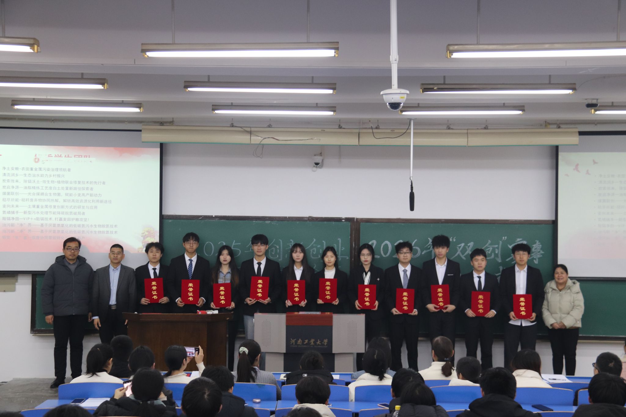 学院党委书记宋芙晖宣读《关于表彰2025年大学生创新创业优秀指导教师、优秀创新团队的决定》,对取得优异成绩的老师与团队表示热烈的祝贺。学院副院长张良波宣读《关于表彰2025年“环小青”创新创业奖学金的决定》。学院副院长陈寒玉宣读《关于“环小青”创新实验班实践创新训练项目立项的通知》。党委副书记杨计国重点介绍了学校、学院的赛事情况、参赛流程、获奖情况以及各项政策支持。接着,学院领导为优秀指导老师、优秀团队进行颁奖并合影留念。