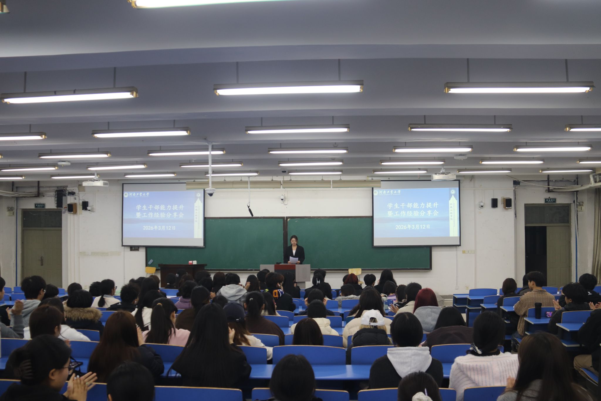 在经验交流环节,学生会主席团及各部门负责人依次上台,围绕过去一年的工作实绩、经验反思与未来规划进行汇报。大家通过详实的数据与生动的案例,全面展示了在文体活动、志愿服务、宣传推广、日常管理等方面的亮点工作。同时,也坦诚剖析了在创新意识、服务广度与部门协同等方面存在的短板,并提出了切实可行的改进思路。