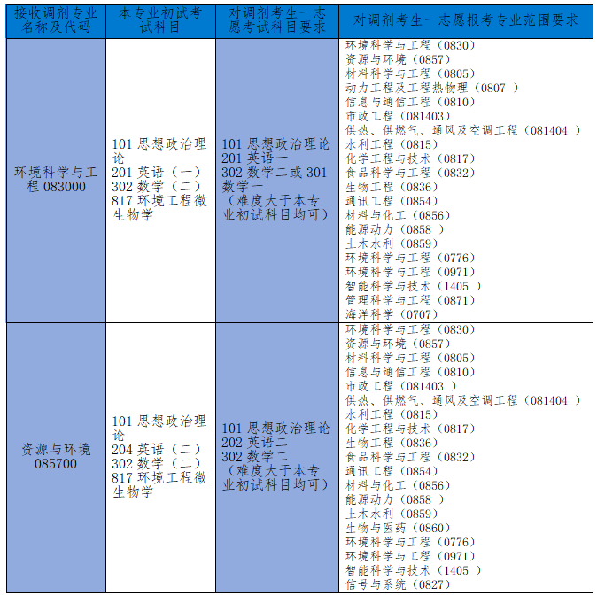 根据2026年我校招生计划和一志愿生源情况,我院环境科学与工程、资源与环境两个专业均有部分调剂名额,以调剂系统设置为准,细则将另行公布。欢迎环境、材料、化工、食品科学与工程、轻工、动力工程及工程热物理、市政工程、生物工程、信息与通信工程、电子信息、能源动力、土木水利、智能科学与技术、信号与系统等专业的同学报名调剂。
