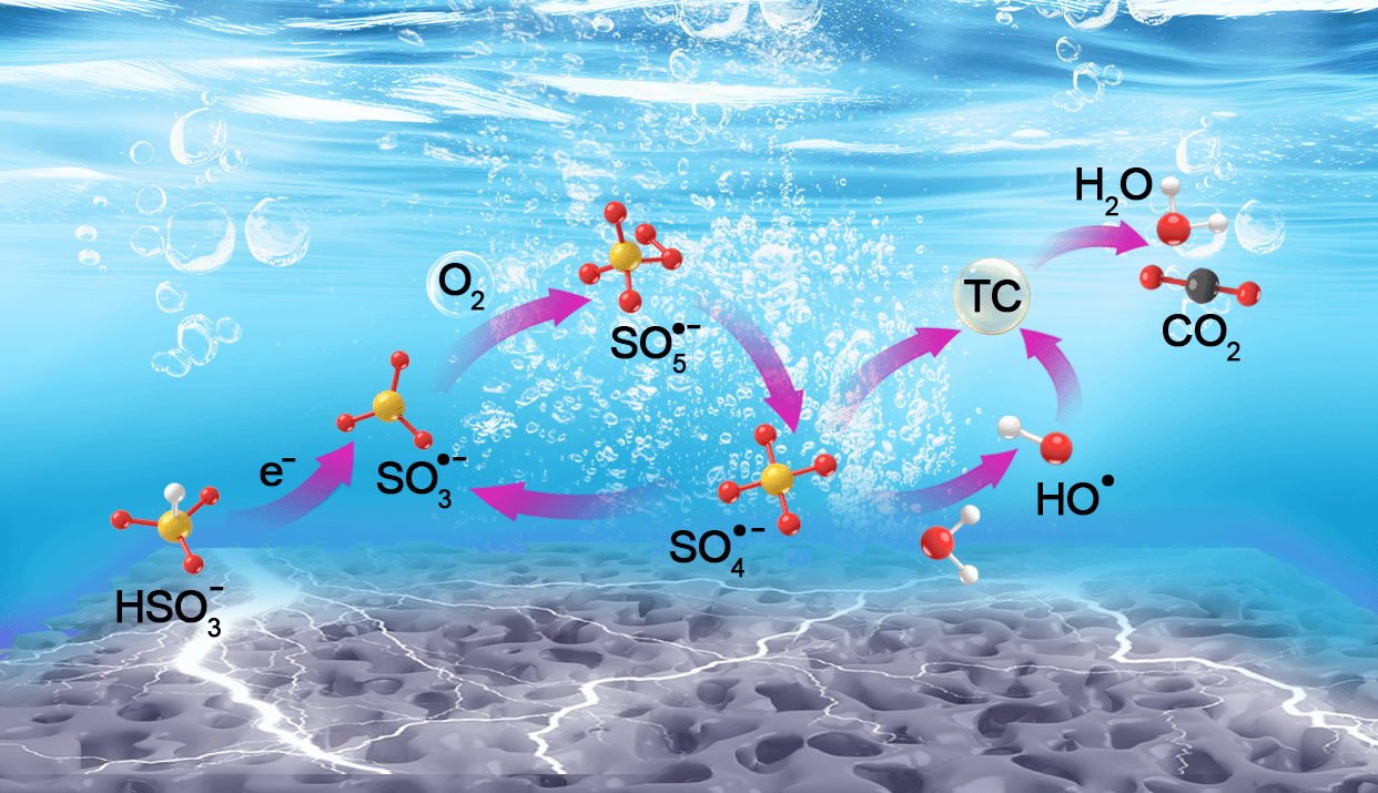 针对抗生素及其代谢物污染水体、传播耐药性的环境难题,研究团队创新研发出基于亚硫酸盐活化的流通式电化学处理体系,为水体中抗生素的深度净化提供了高效、绿色且可规模化的解决方案。该研究提出的E/B-NF/S(IV)流通式体系通过对镍泡沫表面“硼化”,显著提升界面反应活性。在优化条件下,四环素(典型抗生素)降解的表观速率常数达3.6 min-1,较未改性的镍泡沫电极提高7.5倍。机理研究表明,硼化可增强镍表面电子密度、降低功函数并形成局域电场,促进电荷由镍向S(IV)转移,高效生成羟基自由基(HO•)与硫酸根自由基(SO4•-)。同时,流通结构削薄扩散层、缓解传质限制,计算流体力学模拟进一步验证其强化传质优势。该体系在真实水样中表现出良好抗基质干扰能力,生命周期评价结果也证实了其环境可行性与规模化应用潜力。