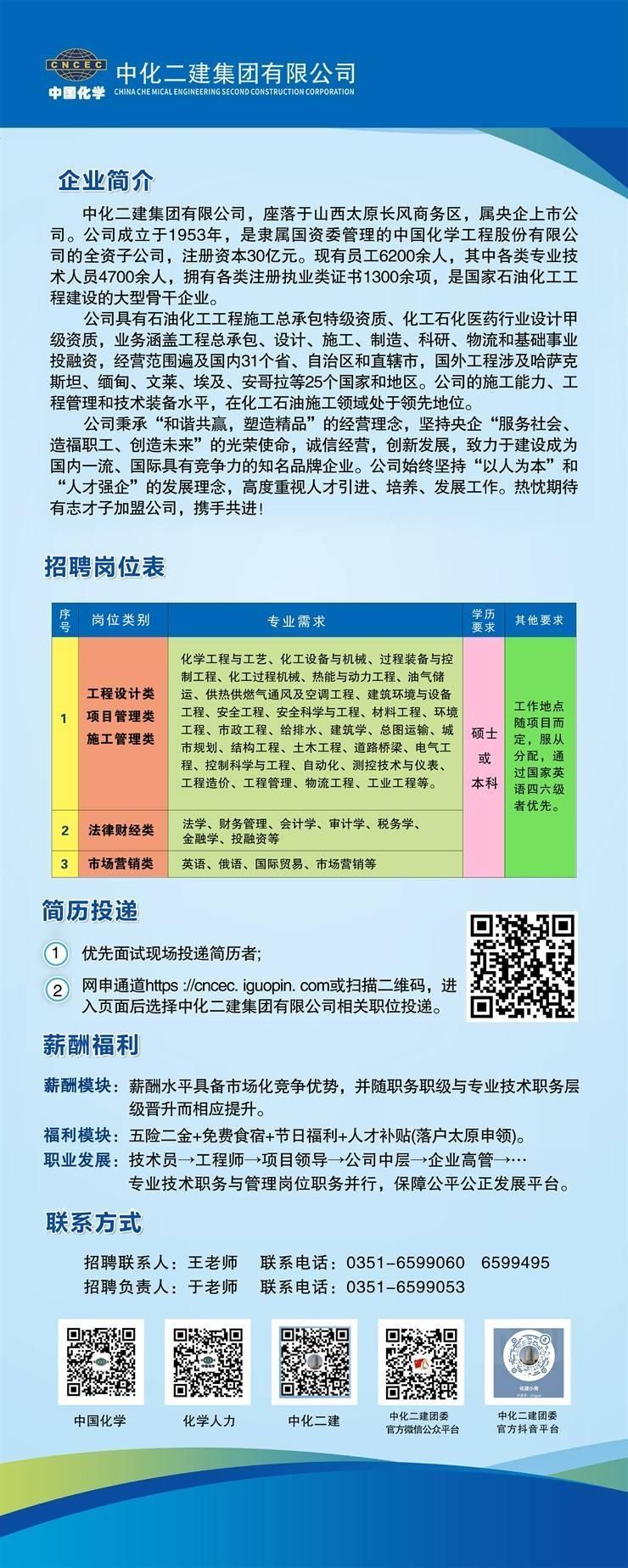 中化二建集团有限公司,坐落于山西太原汾水西畔,是隶属于国资委的化工石油施工总承包特级资质企业,注册资本12亿元。公司成立于1953年,由原中国化学工程第二建设公司整体改制而组建,是中国化学工程股份有限公司(上市代码:601117)的全资子公司。 公司具有石油化工工程施工总承包特级资质、化工石化医药行业甲级设计资质,并较早地通过了质量、环境、职业健康安全管理体系的国际标准认证。公司业务涵盖工程总承包、设计、施工、制造、科研、物流和基础事业投融资,经营范围遍及国内31个省市、自治区和直辖市,国外工程涉及哈萨克斯坦、新加坡、缅甸、斯里兰卡、文莱、安哥拉等25个国家和地区,公司的施工能力、工程管理和技术装备水平,在化工石油施工领域处于领先地位。 六十余载风雨征程,三十多年改革创新,中化二建的发展壮大受益于人才对企业的强力支撑。公司现有职工6000余人,拥有享受政府特殊津贴的专家11人,教授级高工53人,国家注册类工程师、建造师684人,专业技术人员3700多人,员工平均年龄34岁。公司始终坚持“以人为本”和“人才强企”的发展理念,高度重视人才工作。